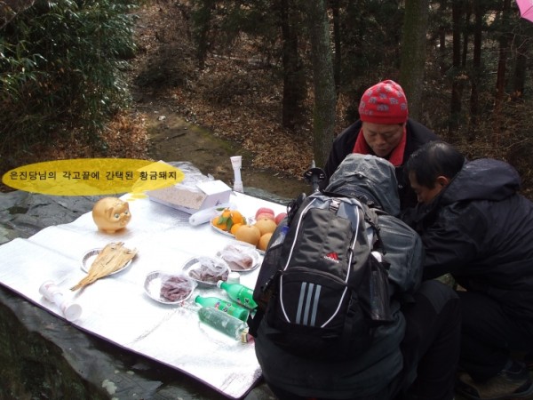 저 엄청 큰 금강 바위위에 하늘에 올리는 제물을 차리고