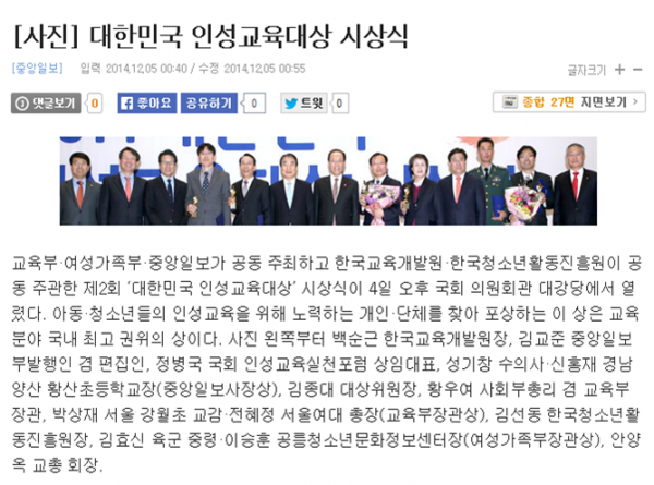 성기창(9회) 동문 대한민국 인성교육대상 수상 김남일(08) 작성일 14-12-09 10:04 12,450회 3건 목록 본문 댓글목록 김남일(08)님의 댓글 김남일(08) 14-12-09 11:09 박경은(03)님의 댓글 박경은(03) 14-12-16 10:12 김홍윤(06)님의 댓글 김홍윤(06) 14-12-17 10:30 목록