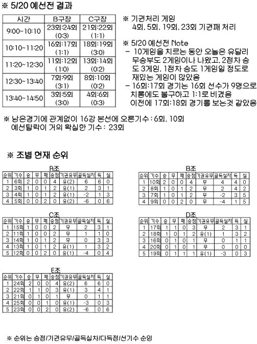 H-리그 5/20 예선전 결과(변경) 페이지 정보 작성자 한성(16) 작성일07-05-21 10:19 조회5,980회 댓글0건 관련링크 목록 본문 마지막 경기인 4회:6회 경기는 4회 선배님들의 인원 부족으로 인하여 기권처리 되었음을 알려드리며 6회:3,4회,기타연합기수 와의 친선경기(1:1) 였음을 공지합니다. 진행상의 미숙함을 사과드립니다. 댓글목록 등록된 댓글이 없습니다. 목록